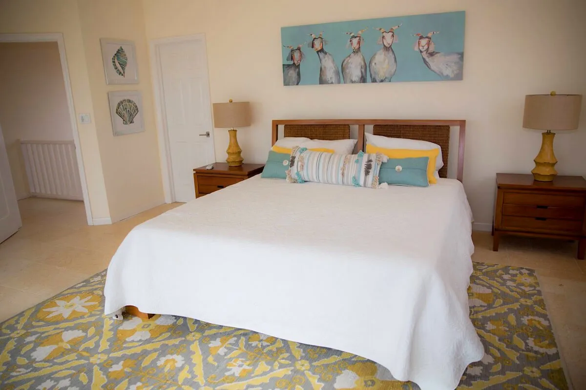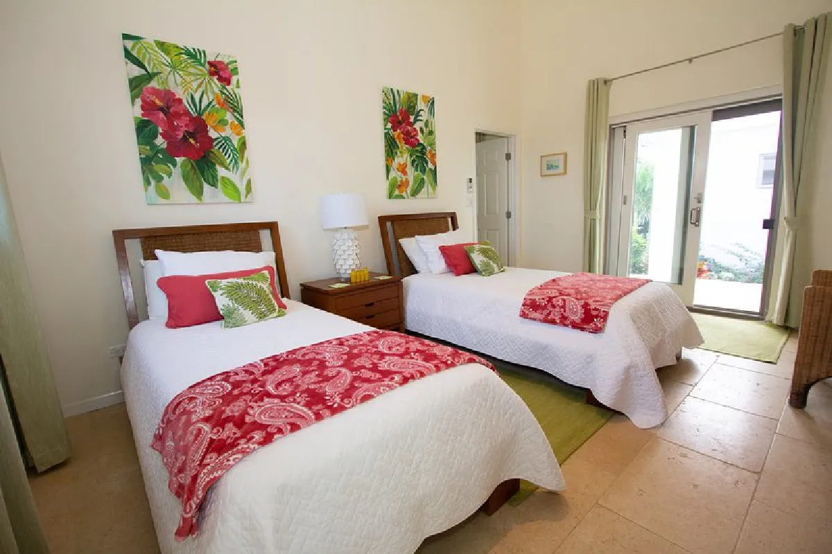 This waterfront villa would be great for a few couples or a large family. There’s two queen suites upstairs and two twin suites downstairs, so adults can relax in solitude while the kids play in the pool and watch TV. There’s also a guest cottage for teens or nannies, which gives everyone their own space.