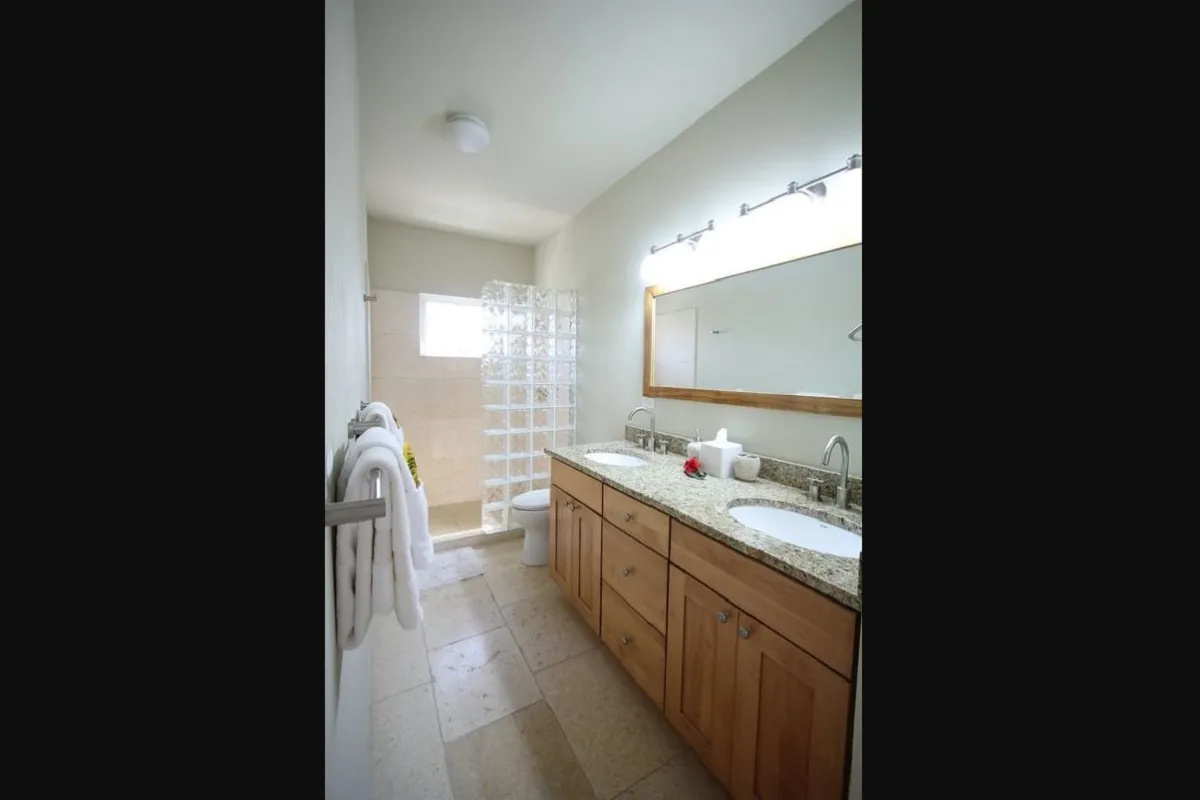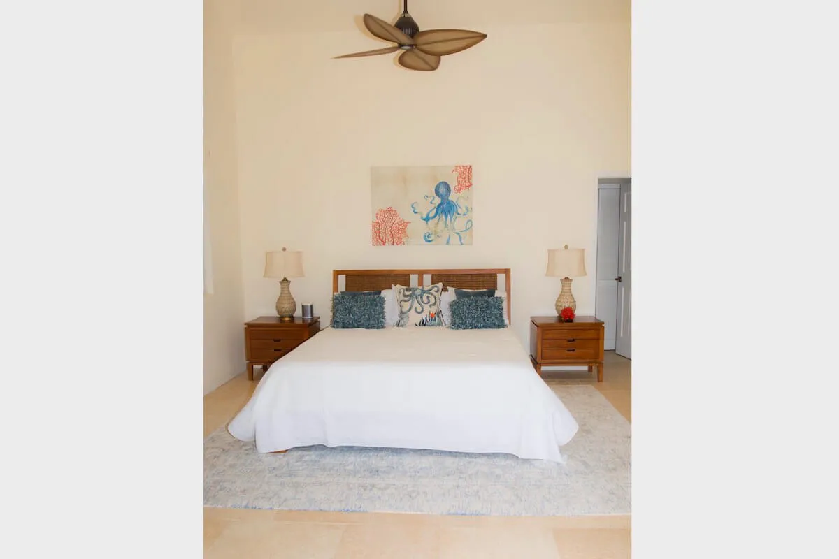 All five bedrooms feature air-conditioning and a Smart TV, including the guest cottage suite. In the main house, there are two identical master suites upstairs and two twin suites downstairs. The master suites each have their own terraces, ensuite bathrooms, and queen beds. The twin suites can be combined and used as a family room, or kept separate. One of these suites has an ensuite bathroom and exterior access only. The detached studio apartment has two twin beds, an ensuite bathroom, and a kitchenette.